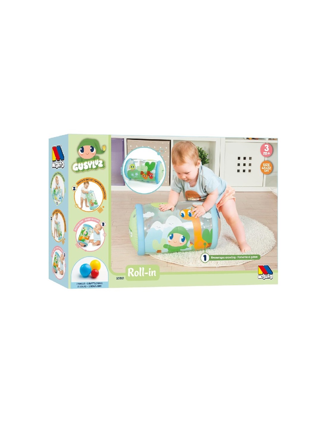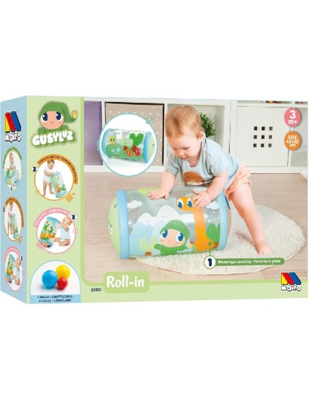 MOLTORODILLO SENSORIAL HINCHABLE GUSY LUZ?¡Acompaña a tu bebé en sus primeros movimientos! Este rodillo hinchable con diseño de Gusy Luz y bolitas sonoras en su interior estimula el gateo, el equilibrio y la coordinación de forma divertida y segura. ???ESTIMULACIÓN MOTRIZ Y SENSORIAL?Las bolitas en su interior suenan al rodar, captando la atención del bebé y fomentando el desarrollo sensorial y motriz mientras aprende a gatear o disfruta del juego sentado. ???LIGERO, SEGURO Y FÁCIL DE USAR?Fabricado con materiales duraderos y libres de BPA, este rodillo es fácil de inflar, desinflar y limpiar, garantizando horas de juego seguro y divertido para tu pequeño. ???Medidas?45 x 22 cm. Peso: 0.4 kg. No requiere pilas. Apto para bebés desde los primeros meses.