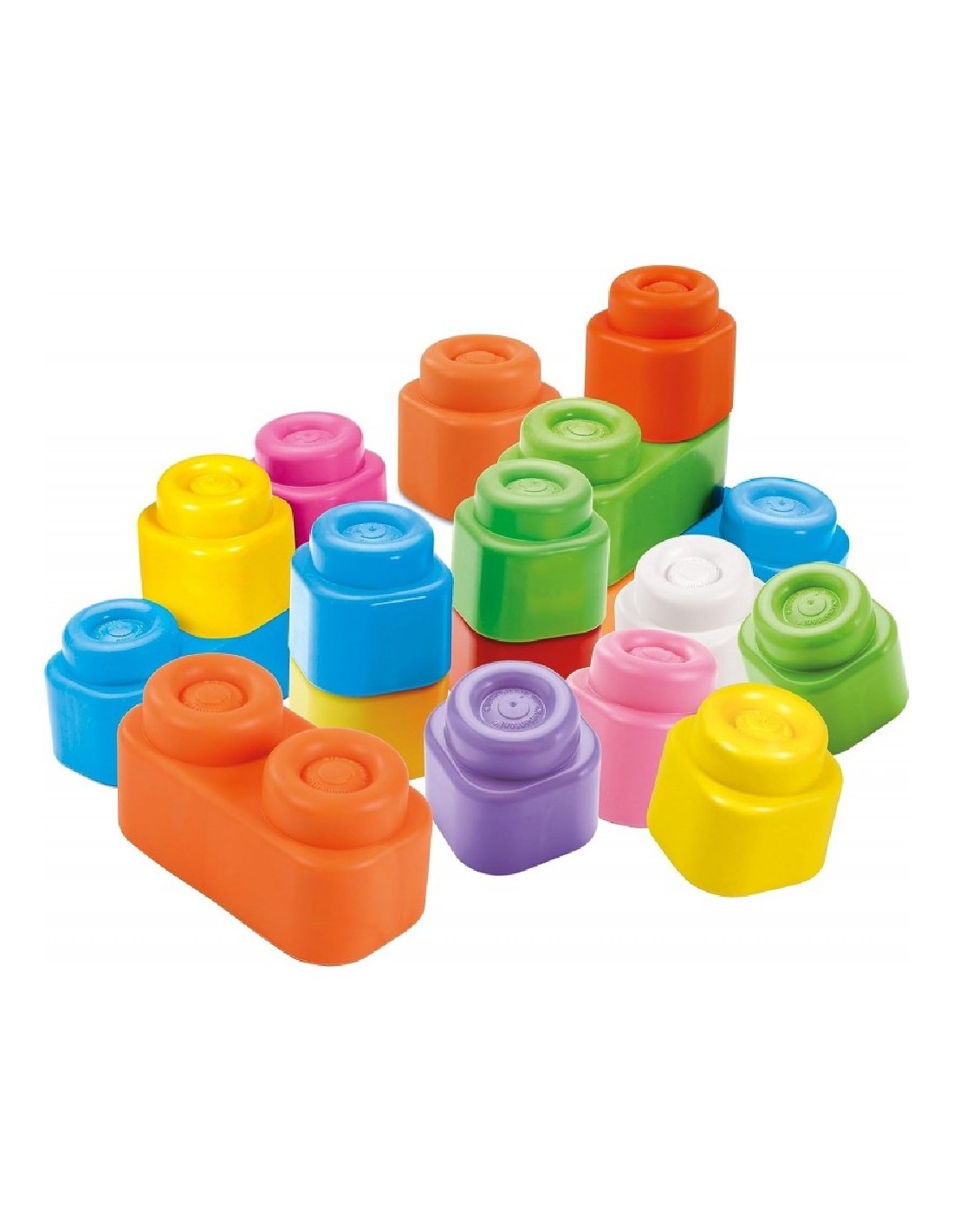 La bolsa transparente contiene 20 Baby Clemmy, unos ladrillos sumamente suaves y coloridos diseñados para que los niños de 6 a 18 meses jueguen con seguridad