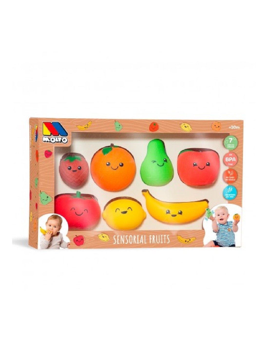 MOLTOSet que incluye 7 frutas: manzana, pera, limón, naranja, tomate, plátano y fresa. Fáciles de agarrar y suaves al tacto, con colores, texturas y formas llamativas que estimulan los sentidos y el desarrollo infantil.