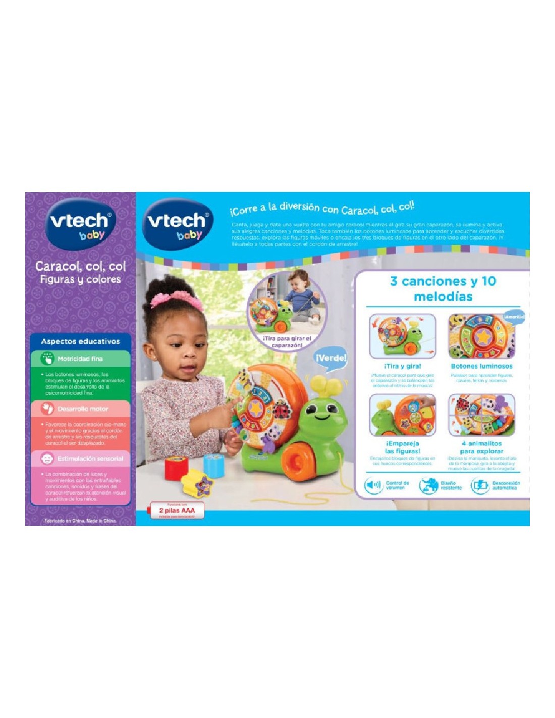 El Caracol, col, col Figuras y colores de VTech está especialmente diseñado para niños a partir de 1 año, fomentando la exploración y el desarrollo de habilidades motoras. Este simpático caracol interactivo combina actividades de arrastre, luces, sonidos y juegos de encaje para proporcionar una experiencia educativa y entretenida. Su caparazón giratorio, las figuras de colores y los encantadores animales incorporados hacen de este juguete un compañero irresistible para los primeros pasos.