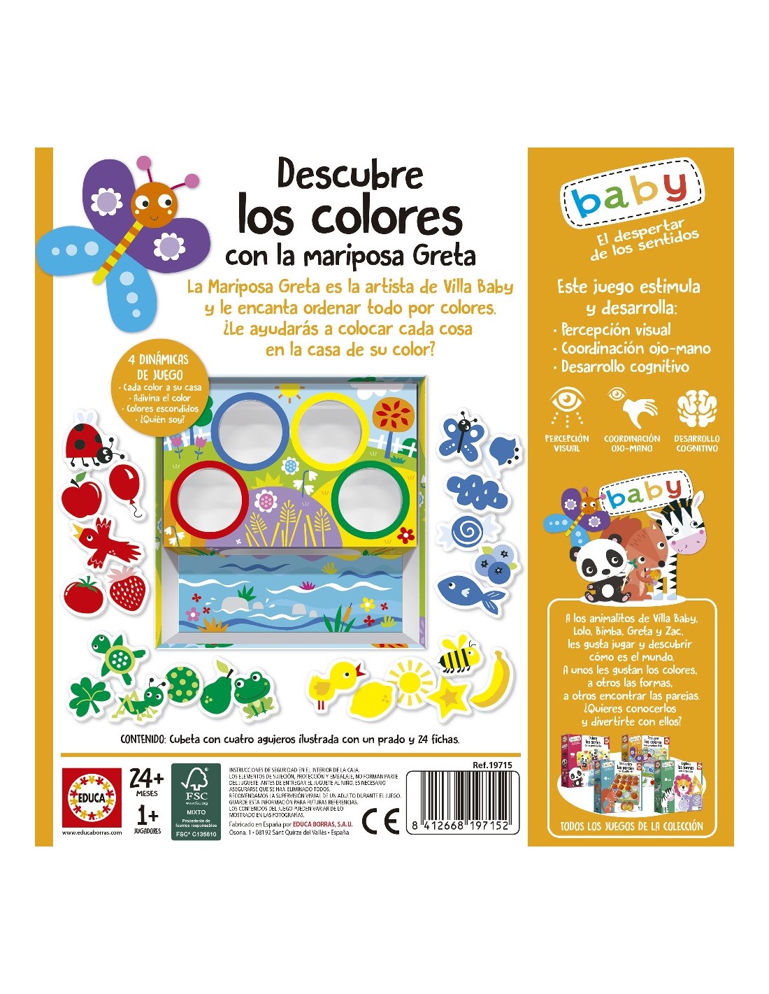EDUCA BORRASEl juego para aprender a asociar y diferenciar colores con la Mariposa Greta. Clasifica los elementos por el color correspondiente: Amarillo, azul, rojo y verde. Este juego desarrolla la atención, clasificación, motricidad fina, la curiosidad y la imaginación.