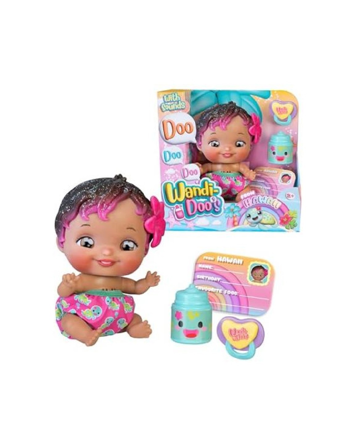 Vestida con un encantador pañal de tortuguitas y su pelo negro con mechas rosas adornado con una flor tropical, Wandi-Doo es una muñeca que invita al juego interactivo. Su biberón y chupete magnético no solo son accesorios, sino que también enriquecen la experiencia de cuidado infantil, haciendo sentir a los niños como auténticos cuidadores. Disfruta con tu pequeño de esta adorable compañera que promete convertir cada día en una nueva aventura llena de amor y aprendizaje.