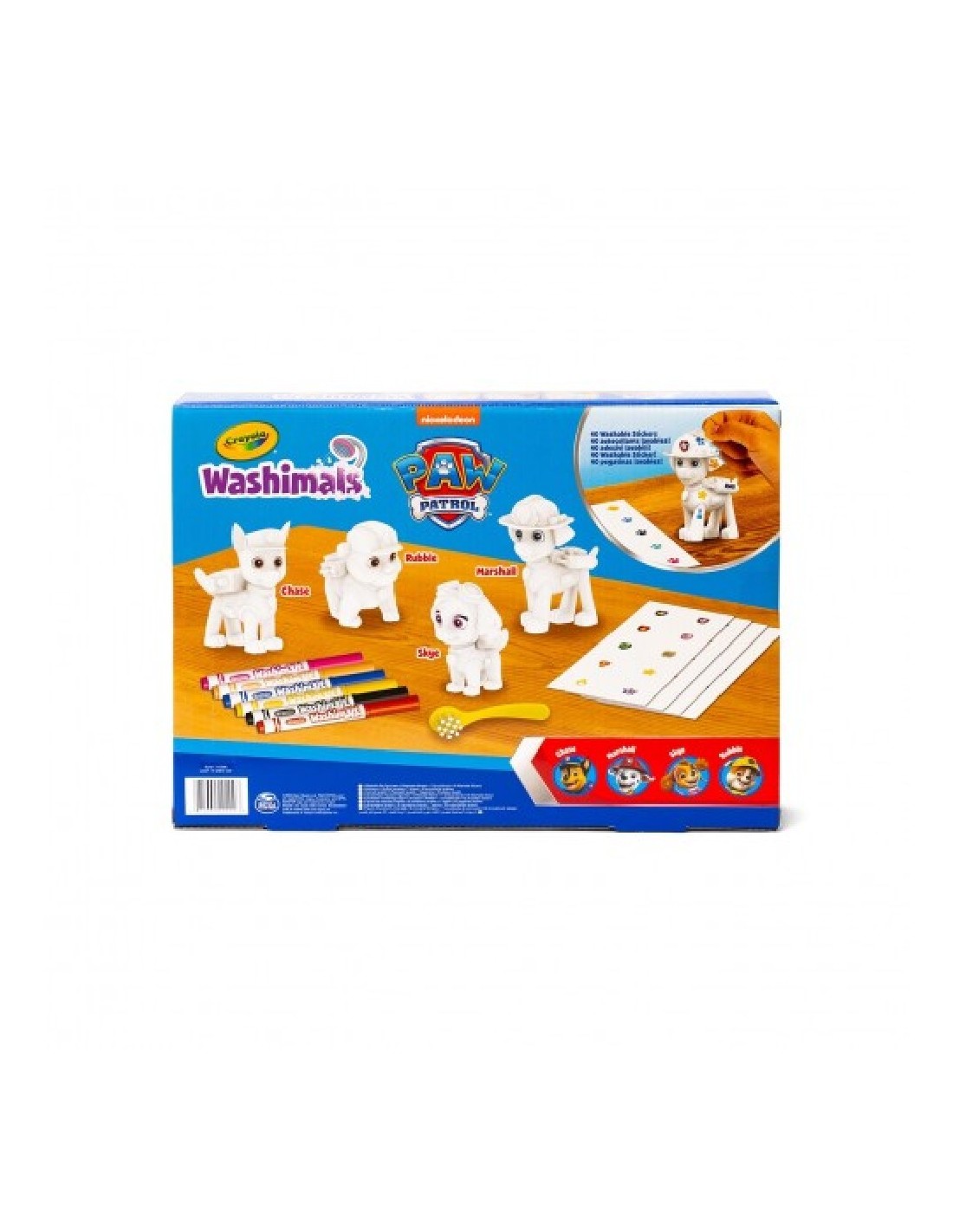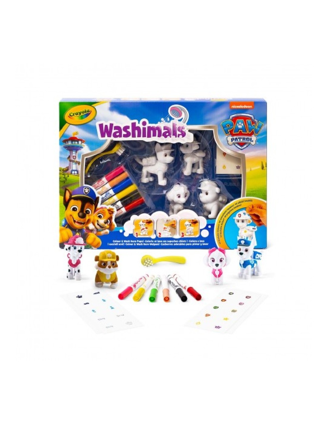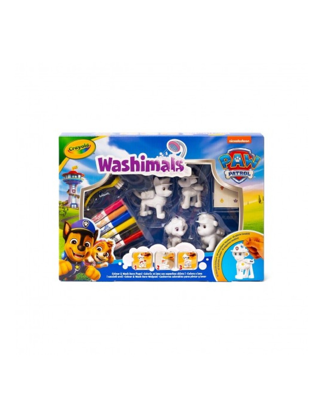 CRAYOLA¡Una nueva y divertida aventura creativa en compañía de los cachorros Washimals Paw Patrol! Los niños podrán decorar las mascotas Chase, Rubble, Marshall y Skye con los rotuladores incluidos y luego darles un baño con aguay cepillito, para que estén listos para una nueva misión. ¡Hay más: la caja incluye también 40 pegatinas lavables para personalizar tus mascotas!