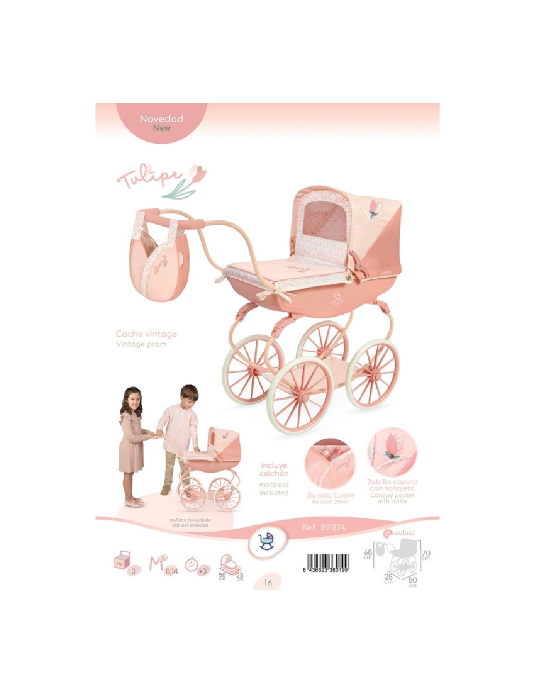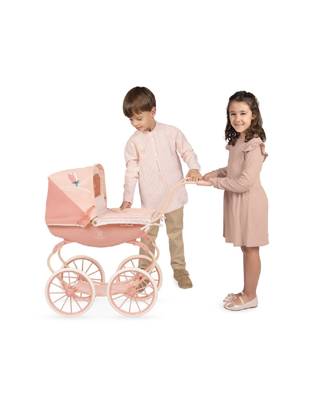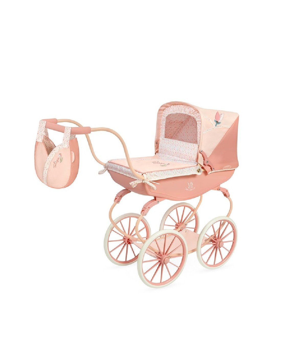 Incluye: 1 carro de muñecas de la colección Tulipe de color rosa con estampado especial de tulipanes, bolso con diseño a juego, bandeja portaobjetos en la parte inferior, ruedas clásicas de gran tamaño con cubierta de foam, colchón, capazo de plástico con tensores, detalles bordados, cubre con pequeño bolsillo y muchos más detalles de lujo.