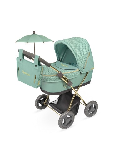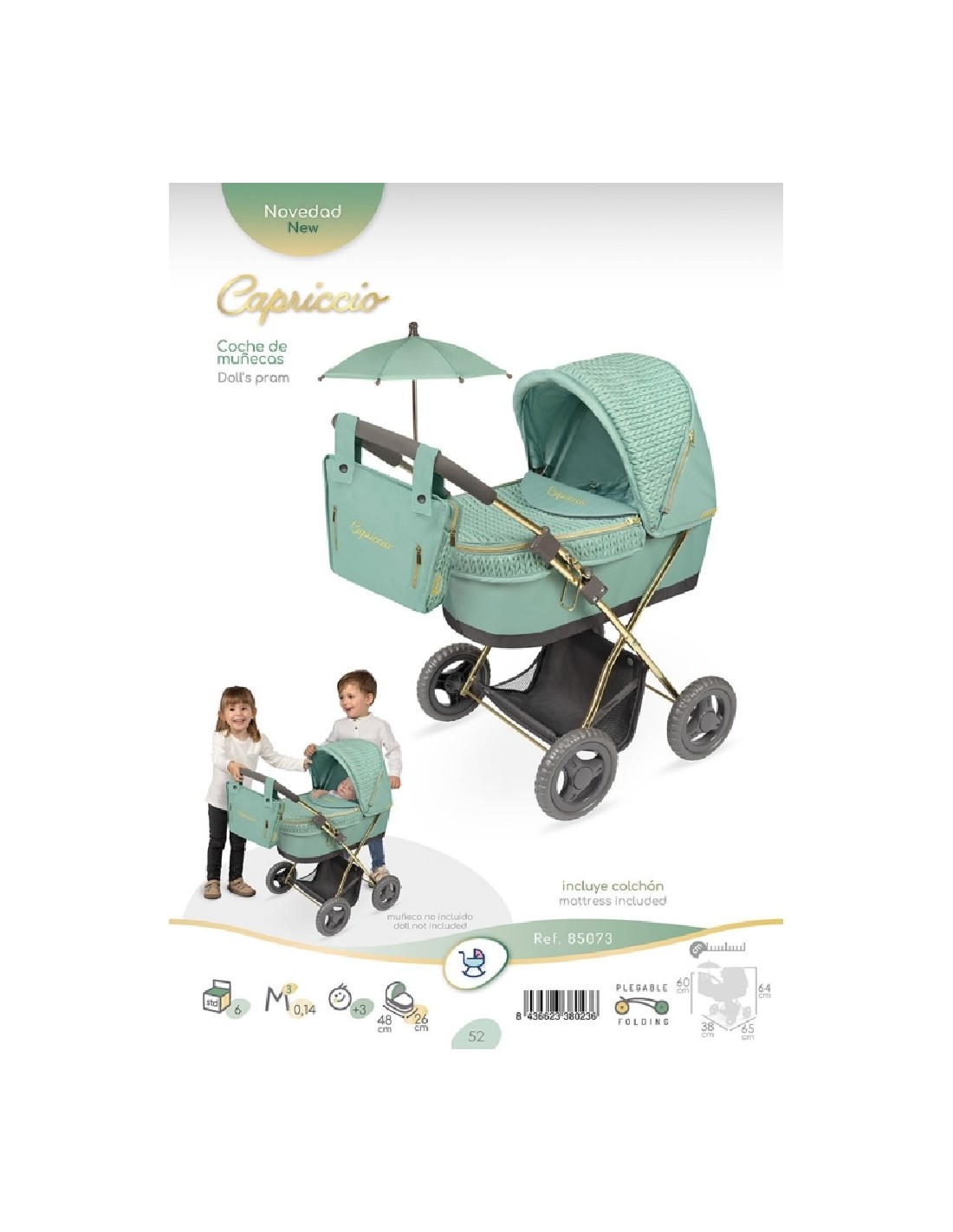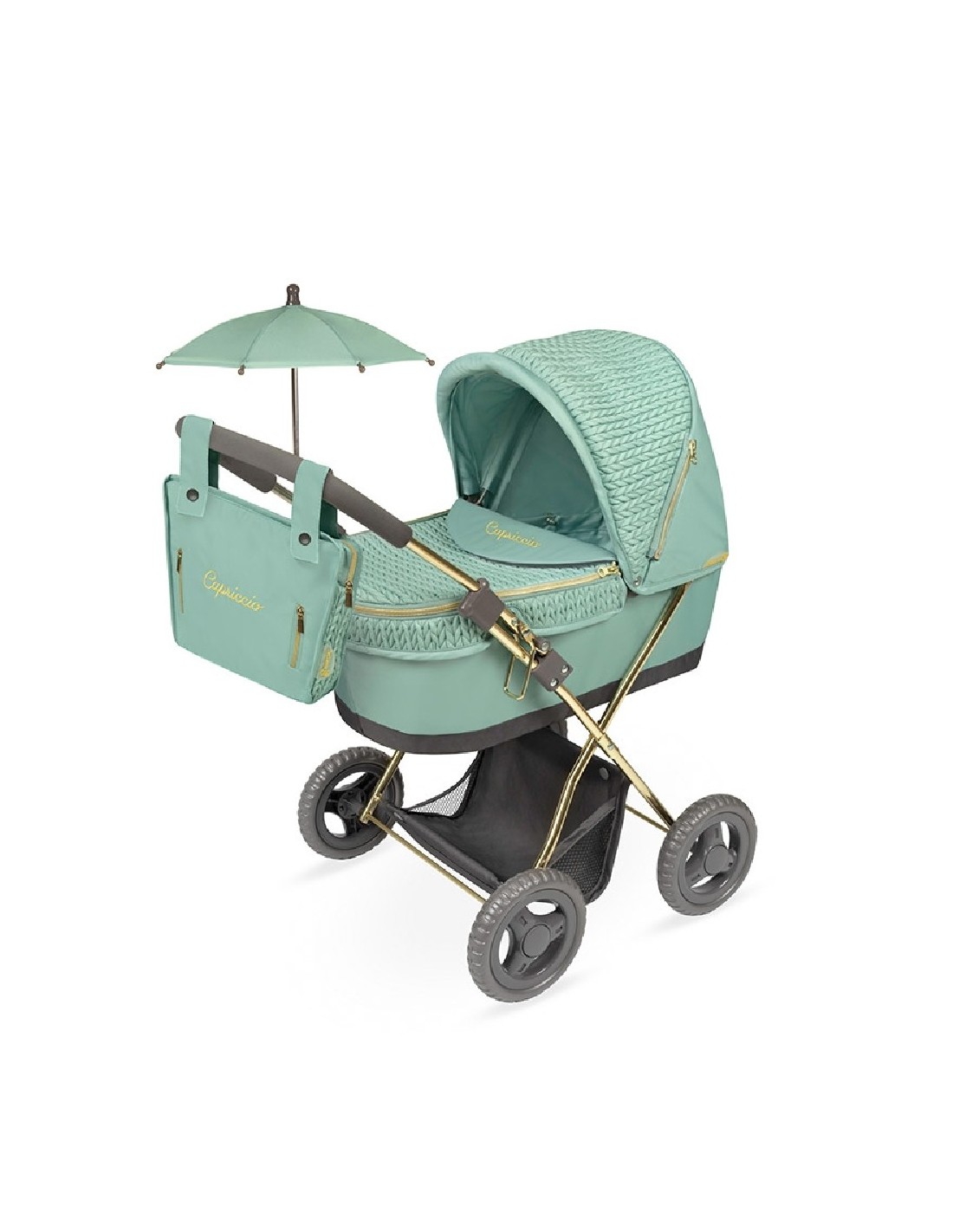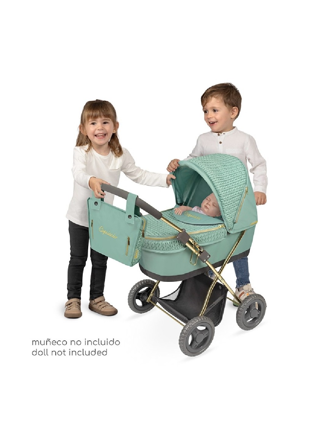 Incluye: 1 carro de muñecas Capriccio de color verde y negro con sombrilla, estructura plegable, bandeja portaobjetos inferior, tela acolchada y lisa combinada, tono cromado en parte de la estructura, ruedas con cubierta de foam, bolso a juego con cremallera dorada y muchos más detalles de lujo.