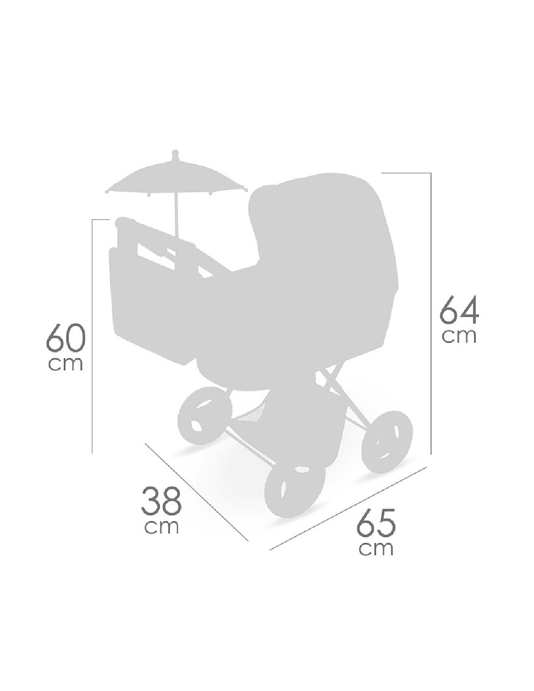 Medidas aproximadas del carro de muñecas abierto: 64 cm de alto (60 cm hasta el manillar), 38 cm de ancho y 65 cm de largo.