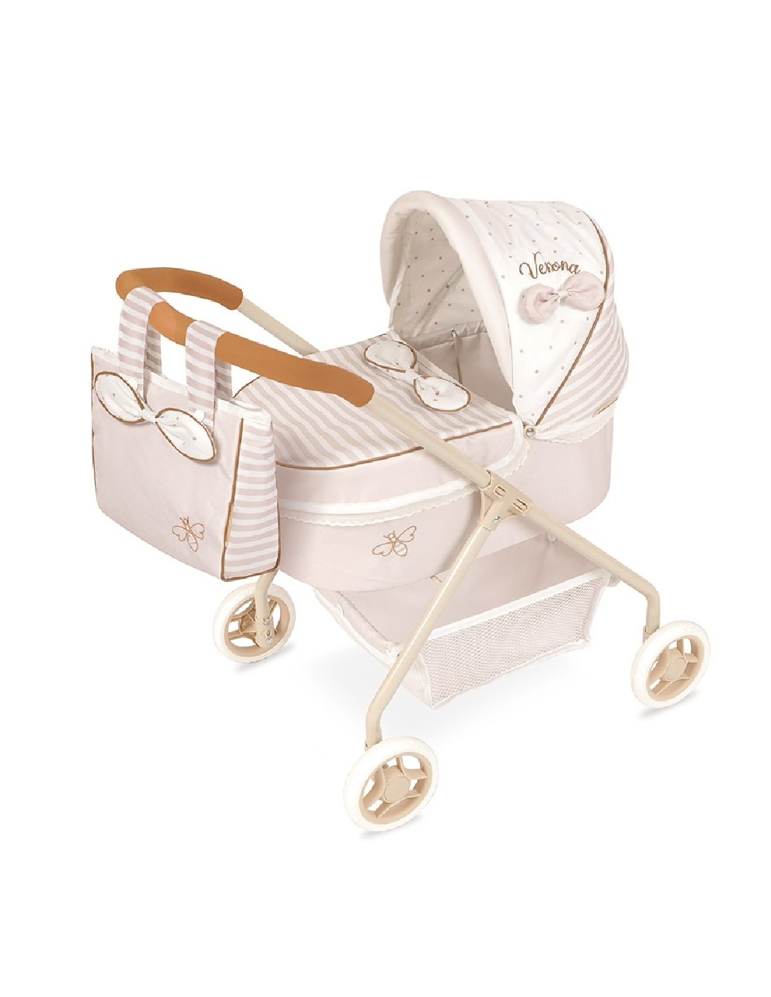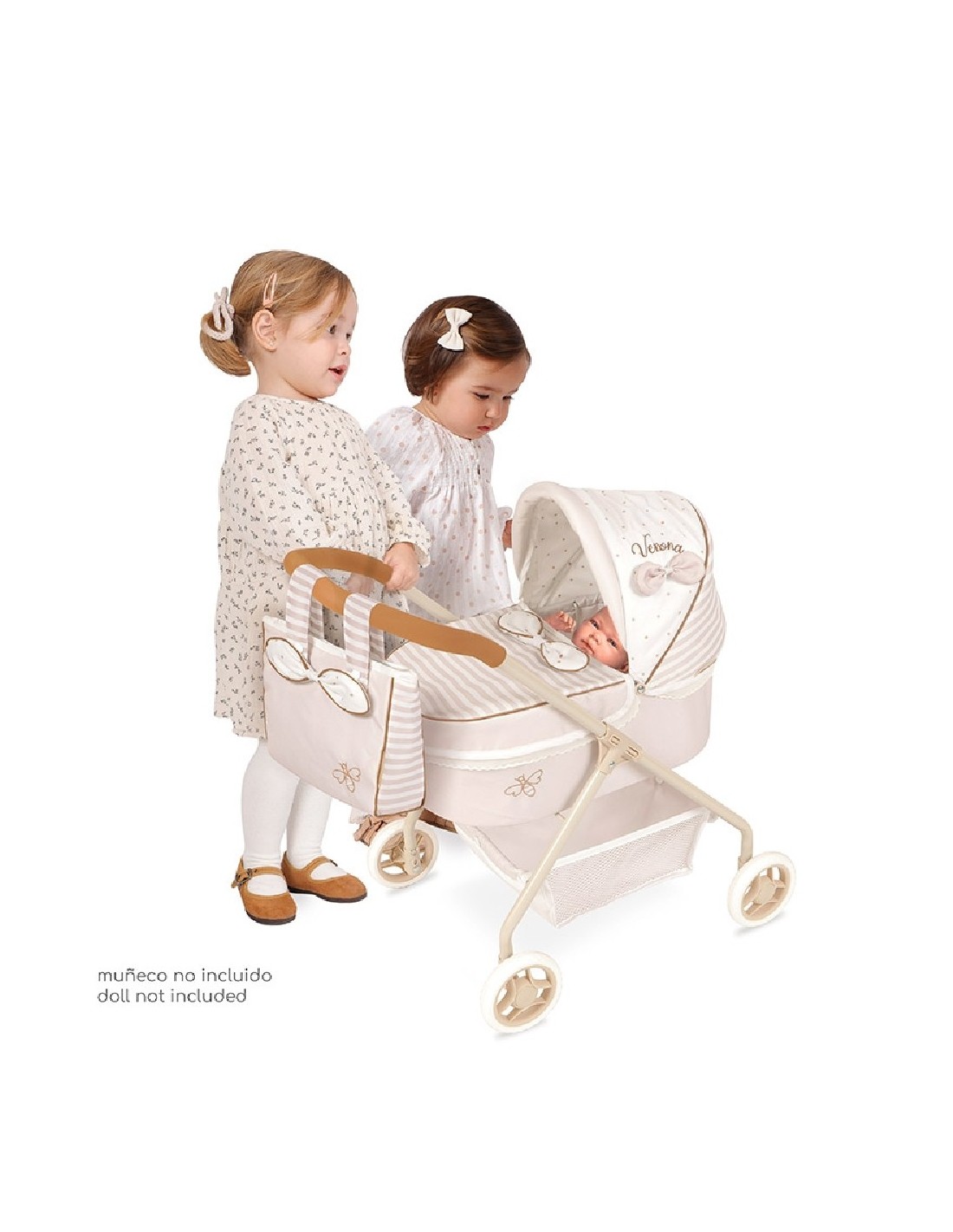 El pack incluye: Carro de muñecas de color blanco y beige con estampado especial de la linea Verona, bandeja inferior de tela portaobjetos, ruedas con cubierta de foam silencioso, manillar acolchado, capazo rígido, capota extensible, bolso para el carro a juego y más detalles de lujo.