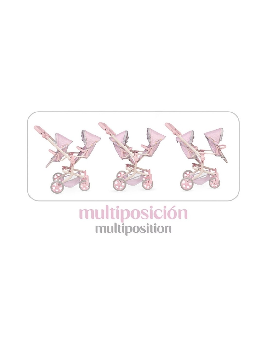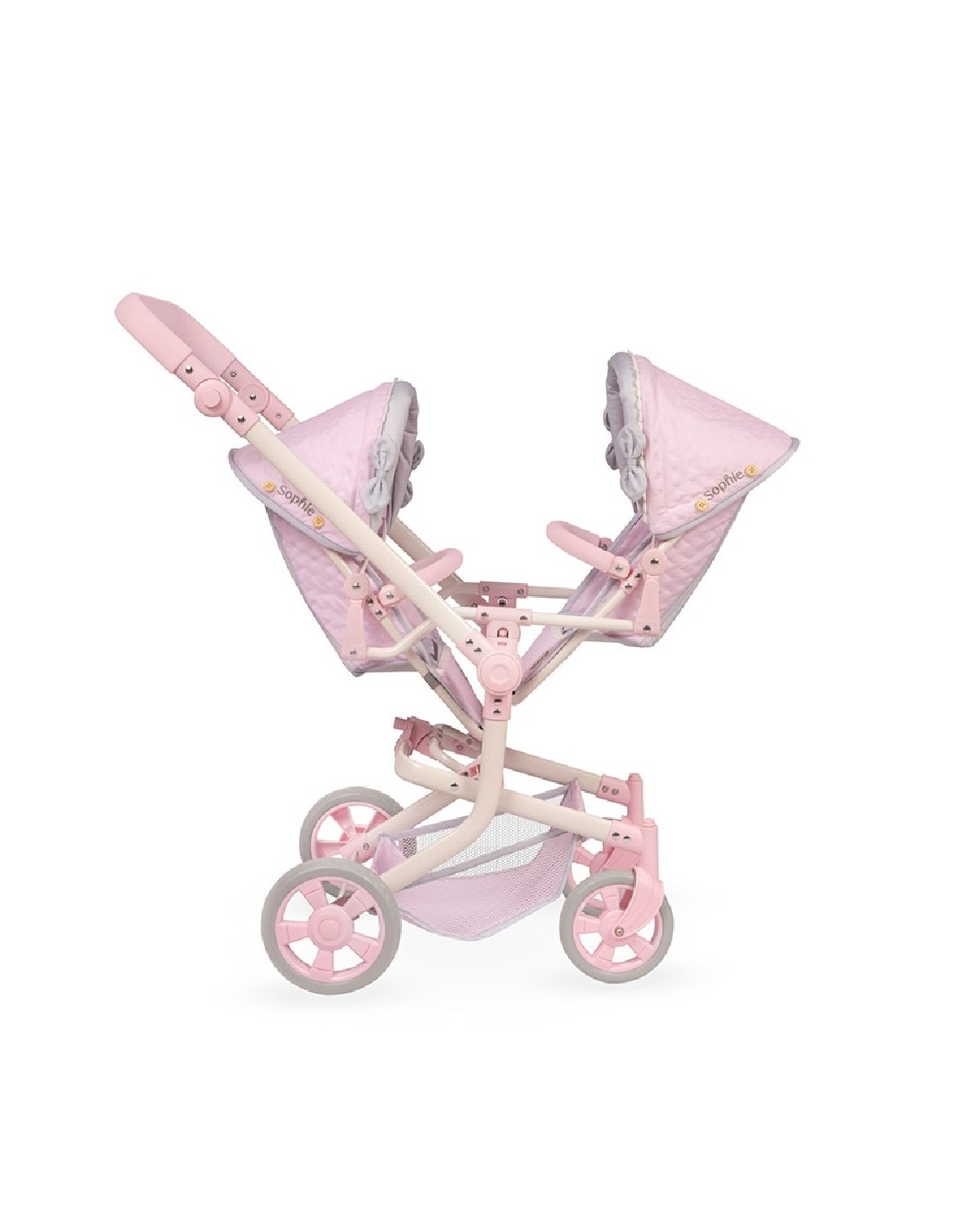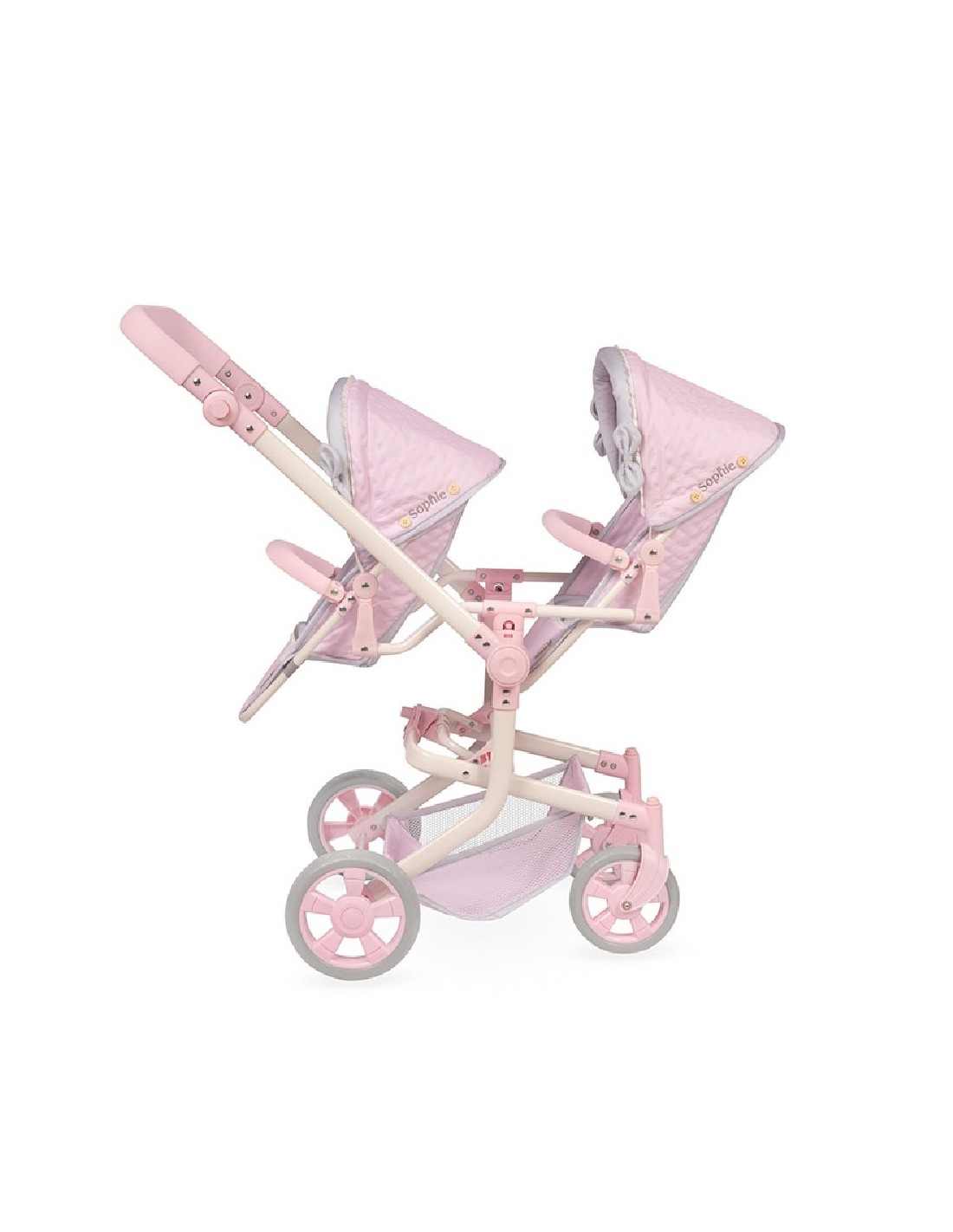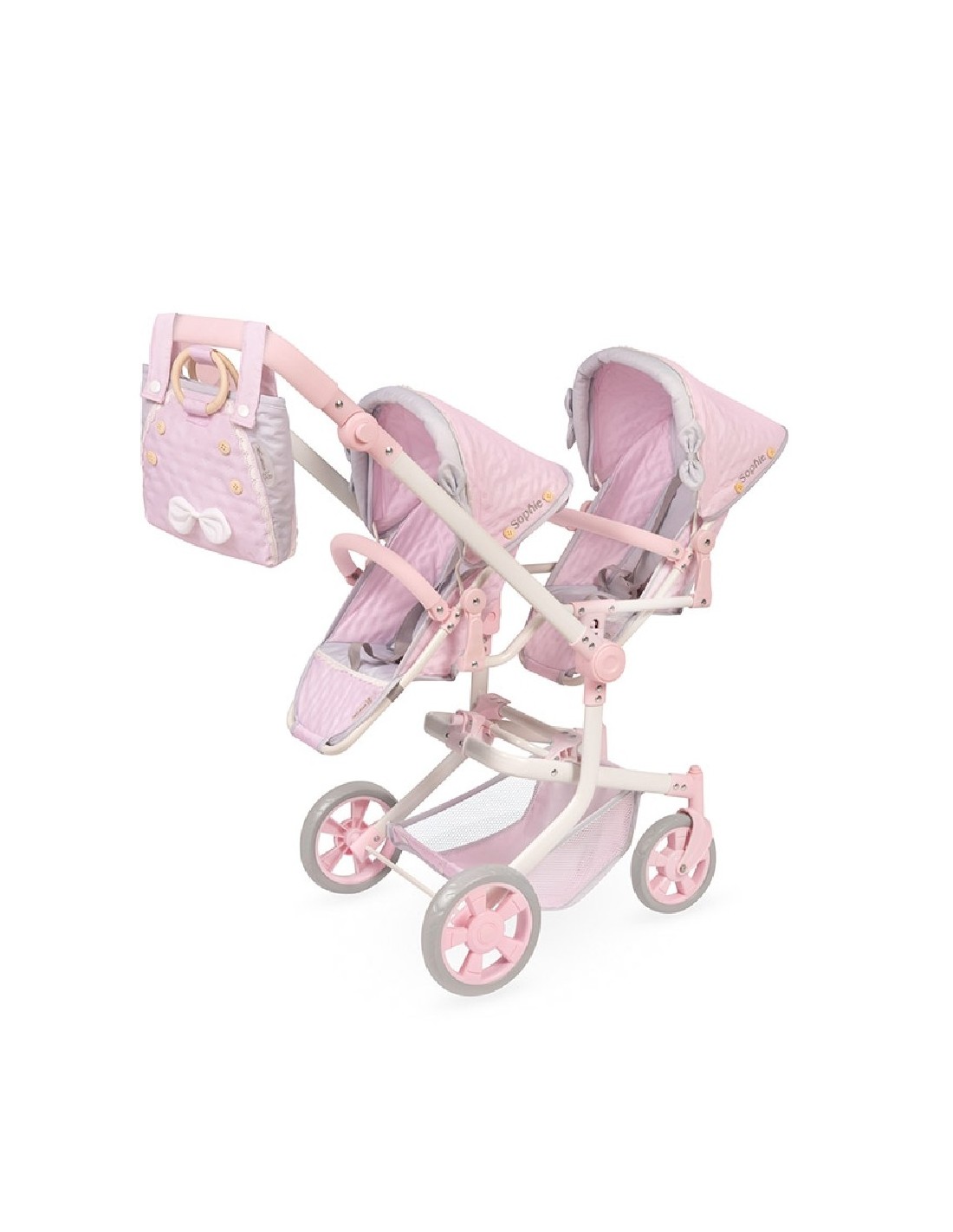 Incluye: 1 silla gemelar de paseo de la linea Sophie de color rosa con detalles grises, estructura plegable multiposiciones, tela acolchada, manillar con altura ajustable, lazos acolchados, detalles bordados, botones decorativos en madera natural, ruedas delanteras giratorias, bolso a juego con asas de madera natural, ruedas con cubierta de foam, bandeja portaobjetos de tela, cinturones de seguridad y muchos más detalles de lujo.