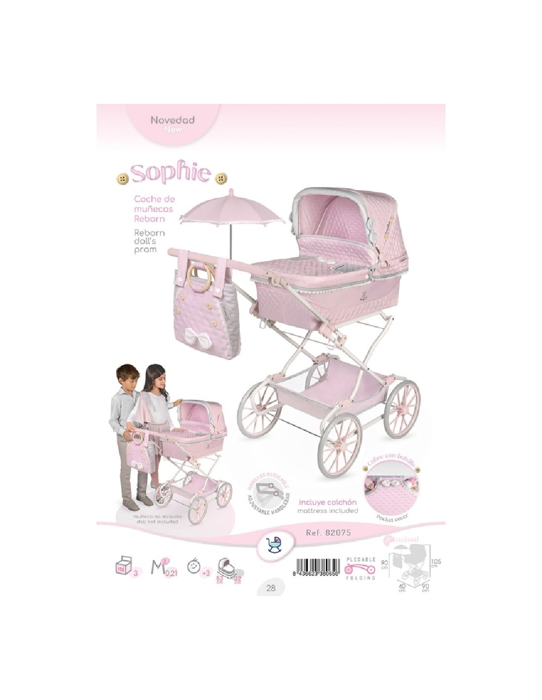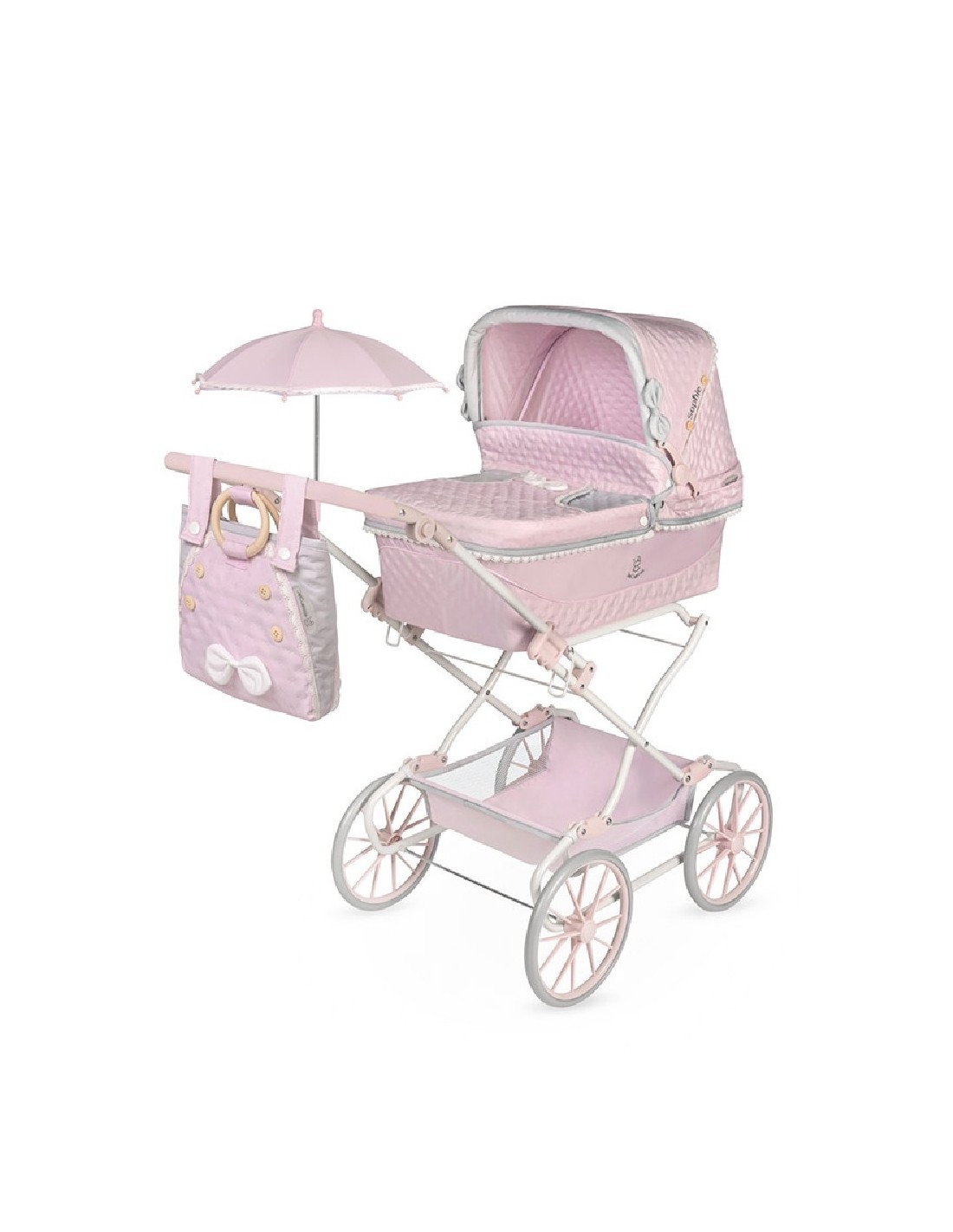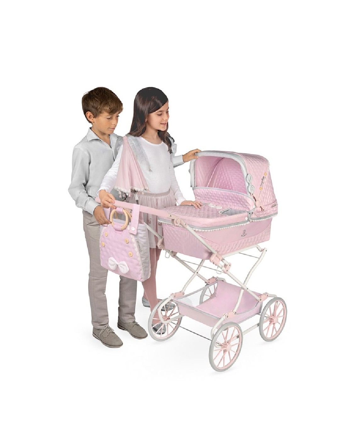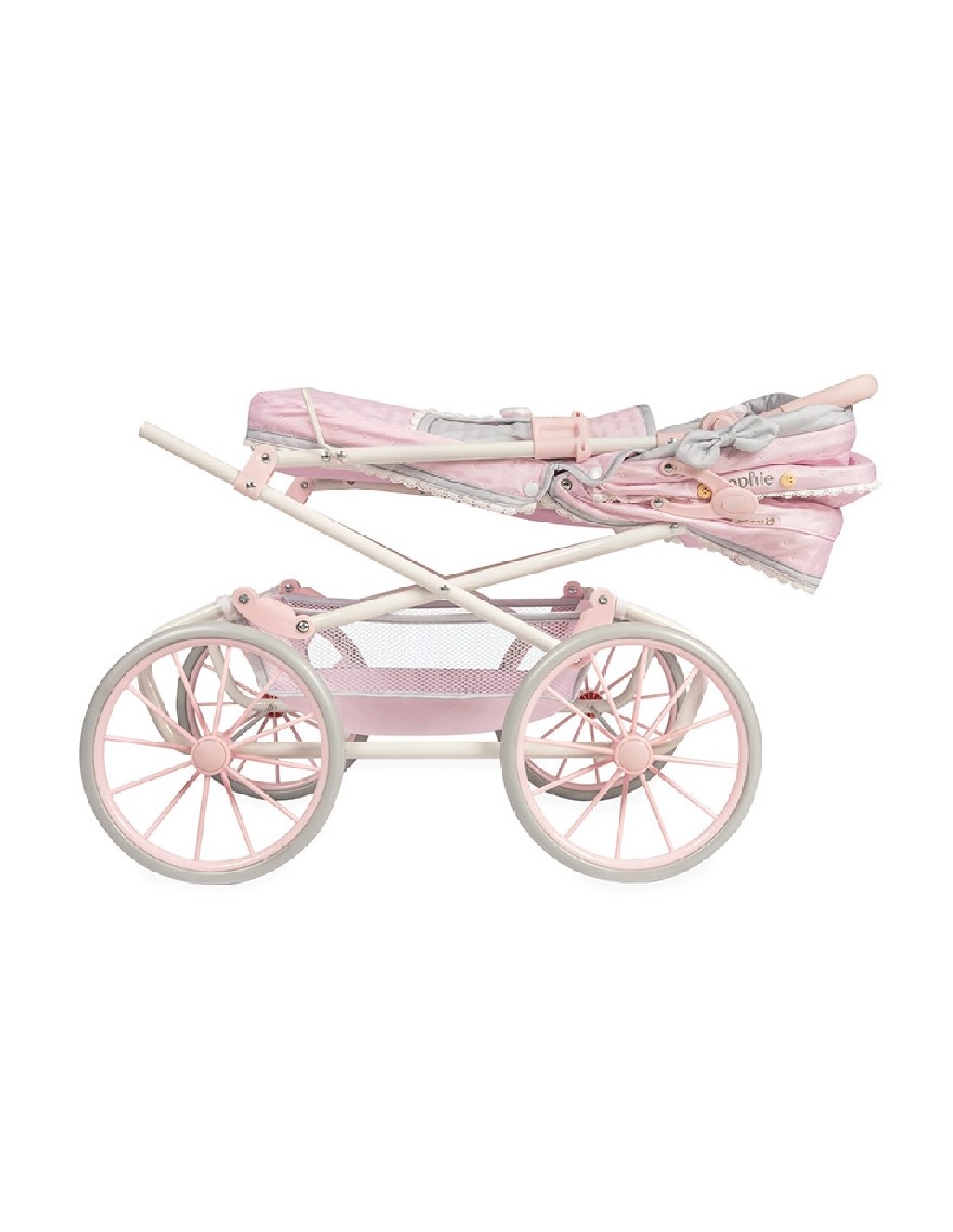Incluye: 1 carro de muñecas de la linea Sophie de color rosa con detalles blancos y grises, estructura plegable, manillar con altura ajustable, suspensión, lazos acolchados, detalles bordados, botones decorativos en madera natural, bolso a juego con asas de madera natural, sombrilla, grandes ruedas con cubierta de foam, tela acolchada, bandeja portaobjetos, capota con tensores, colchón, mantita, cubre con pequeño bolsillo y muchos más detalles de lujo.