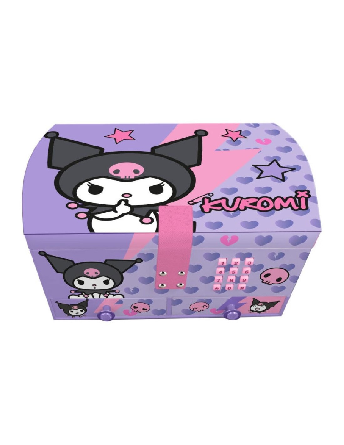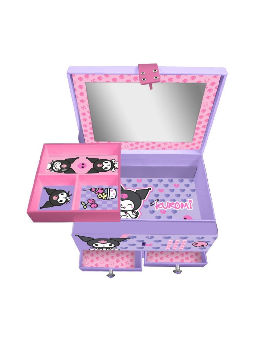 kids licensingEl joyero musical de Kuromi es el complemento ideal para guardar tus joyas y accesorios en tu habitación. Dale el toque de glamour que le falta a tu cuarto con este joyero musical de moda. Tiene todos los compartimentos necesarios para que organices bien tus joyas: bandeja con compartimentos, compartimento escondido grande y cajones. Además, tiene el toque musical de los joyeros de toda la vida, para no perder la tradición. Y esto no es todo... ¡se cierra con código secreto! Tus joyas no habían estado nunca a tan buen recaudo.