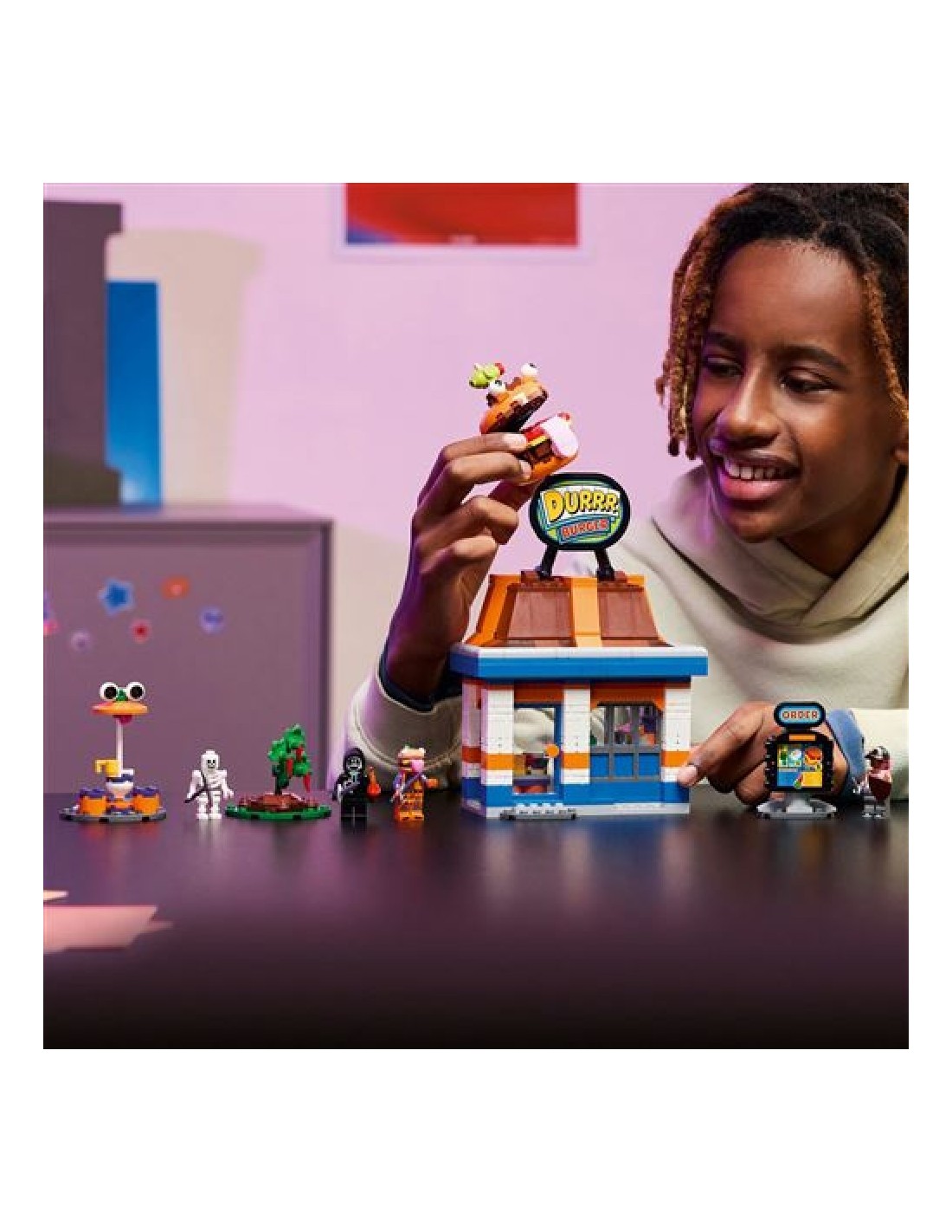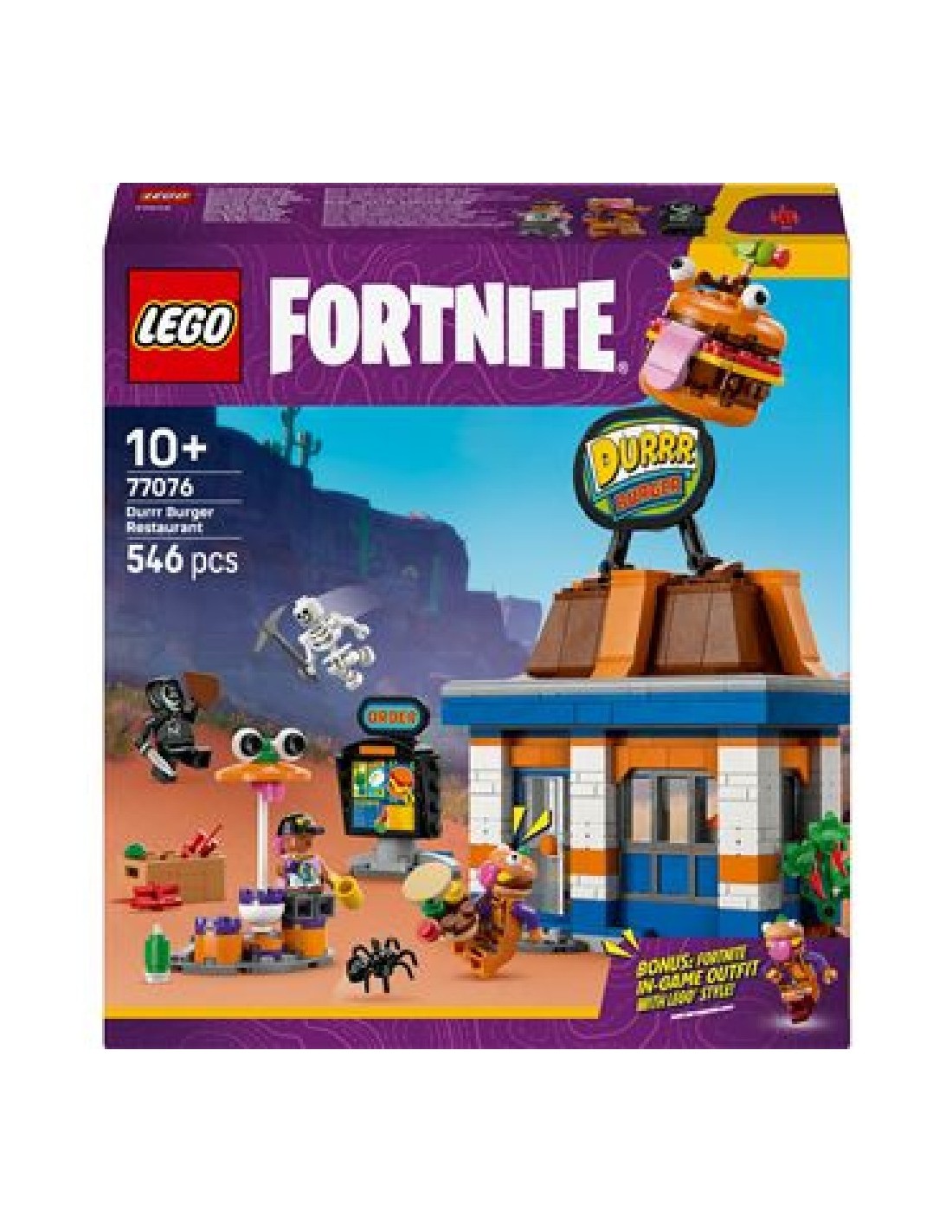 Pack de la colección Lego Fornite, compuesto de 546 piezas, con las que podrás construir el restaurante Hamburrrguesa.