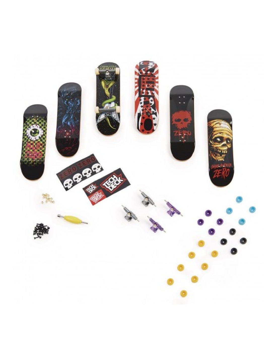 Incluye: 1 monopatín montado, 5 tablas con cinta antideslizante, 2 hojas de stickers, 1 herramienta, 20 ruedas variadas, 4 ejes ...