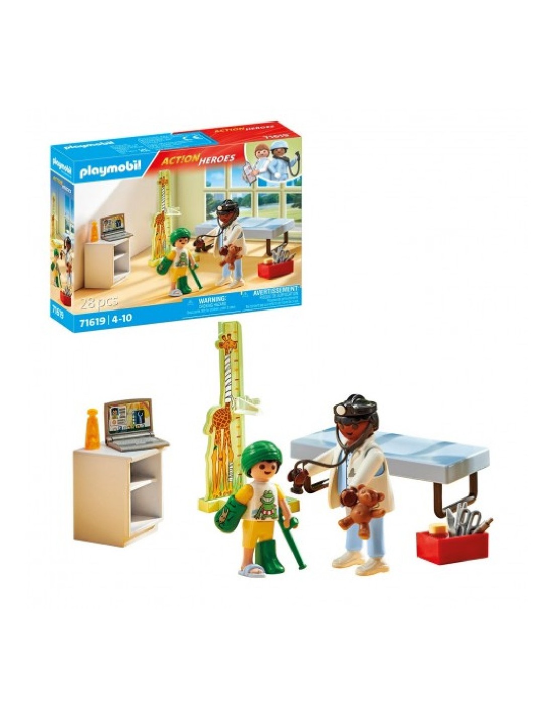 En la consulta del pediatra, incluso los pacientes más pequeños se recuperan rápidamente. Un osito de peluche les hace compañía durante los exámenes. Con sofá, divertida báscula de animales para medir el tamaño del cuerpo y varias vendas para intercambiar y apósitos removibles. Se puede combinar perfectamente con el resto de sets hospitalarios de PLAYMOBIL.